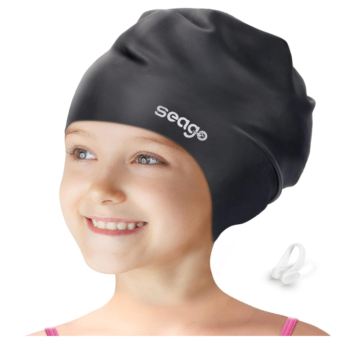 Seago kids swim caps are designed with extra large space to suit cute head and various hairstyles: curly hair, long hair, braids, dreadlocks, crochet mambo, extensions, weave, Afro hair. Enough to wrap the hair and not tangle when swimming.